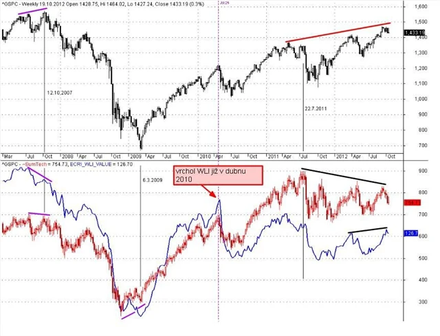 To téma se vrací již déle než rok. Americký Weekly Leading Index (WLI) je indikátor ukazující s předstihem směr vývoje americké ekonomiky. Pátého října začal po mnoha týdnech růstu opět klesat. Index je sestavován společností ECRI (Economic Cycle Research Institute), která si od začátku století vybudovala velice solidní renomé v předpovědích dalšího ekonomického vývoje. Jen poslední, stále aktualizovaná předpověď recese (od září 2011) zatím nevychází.