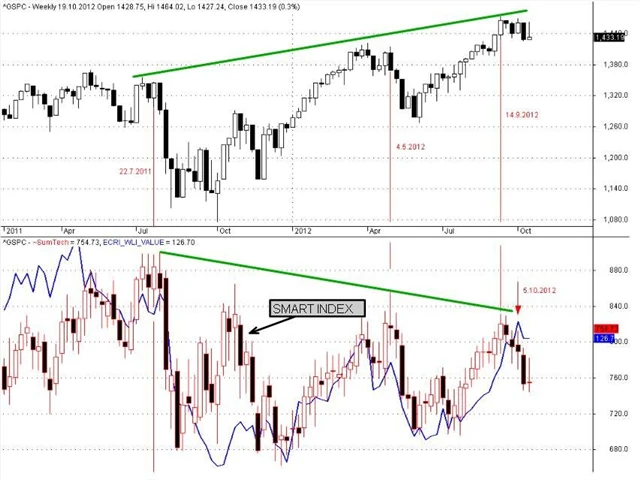 Aktuální vývoj (2008 až 2012) – zatímco WLI lépe ukázal cenový vrchol indexu S&P 500 v říjnu 2007, SMART index vedl trhy nahoru v březnu 2009. Své cenové dno totiž vytvořil již s 5měsíčním předstihem v říjnu 2008. WLI nyní již třetí rok diverguje od indexu S&P 500, protože jeho maximum nastalo již v dubnu 2010. Od té doby vytváří nižší vrcholy. SMART index vytvořil své maximum v červenci 2011, od té doby také klesá.