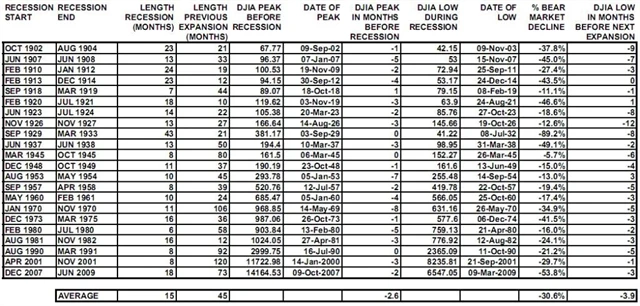 DJIA vytvoří typicky vrchol 2,6 měsíce před začátkem recese. Následně propadne v průměru o 30,6 % a vytvoří dno před začátkem konjunktury. Růst akcií začíná v průměru 3,9 měsíce před ekonomickou expanzí. Nejmenší pokles indexu se v historii pohyboval na úrovni 5,7 % v roce 1945, největší byl pak 89,2 % v období let 1929 až 1933. Předchozí expanze trvaly v průměru 45 měsíců. Před rokem 1990 (začátek úvěrové expanze a extrémně uvolněné monetární politiky) trvaly expanze v průměru 37 měsíců.