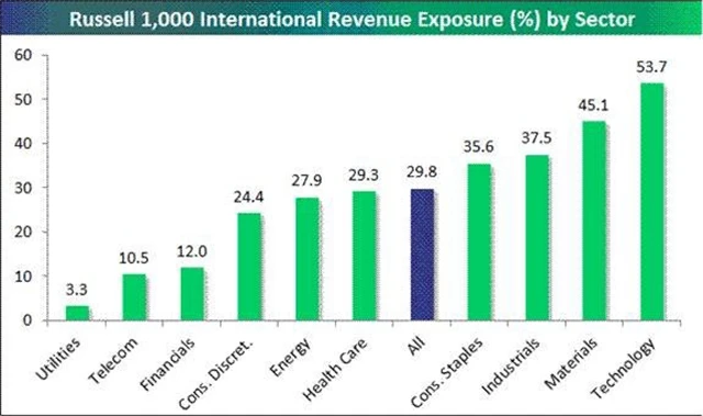 Tržby ze zahraničí v jednotlivých sektorech (Zdroj: Bespokeinvest)