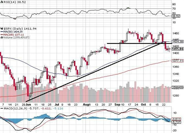 Index S&P 500 nakonec přece jen vystoupil z býčího kanálu a dostal se pod 50denní klouzavý průměr. Za poslední týden ztratil 1,5 %. Cena od červnových minim do říjnových maxim pravidelně posilovala, v úterý však index zřetelně uzavřel níže a propadl se pod hladinu podpory 1 425 až 1 430.