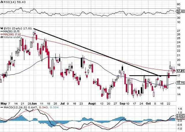 Index volatility VIX v uplynulém týdnu vzdal své býčí nastavení a obchoduje se nad hladinou 17. V srpnu vylétl na 19, aby se později vrátil zpět. Nicméně index S&P 500 v té době nedokázal prolomit rostoucí trendovou čáru. Jestliže denní zavírací cena VIX skončí nad 19 (a následně nad 21), bude to signál, že je index S&P 500 v medvědím trendu. Pohyb mezi 17 a 19 znamená pro akcie neutrální výhled, a návrat pod 17 by byl pozitivním signálem.