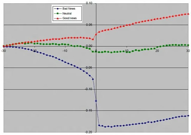 Studie totiž prokázala, že nejpodstatnějším faktorem pro vývoj ceny akcie společnosti po zveřejnění hospodářských čísel, je předchozí výhled firmy. Ať firma před výsledky byla pesimistická, nebo naopak optimistická, naplnění tohoto očekávání vedlo po zveřejnění výsledků v průměru k růstu ceny akcie takové firmy.