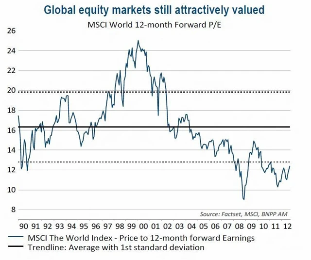 Světové akcie jsou z historického pohledu stále relativně levné. Tvrdí to analytici z BNP Paribas ve svém říjnovém investičním reportu. Využívají k tomu ocenění na základě očekávaných zisků v příštích 12 měsících.