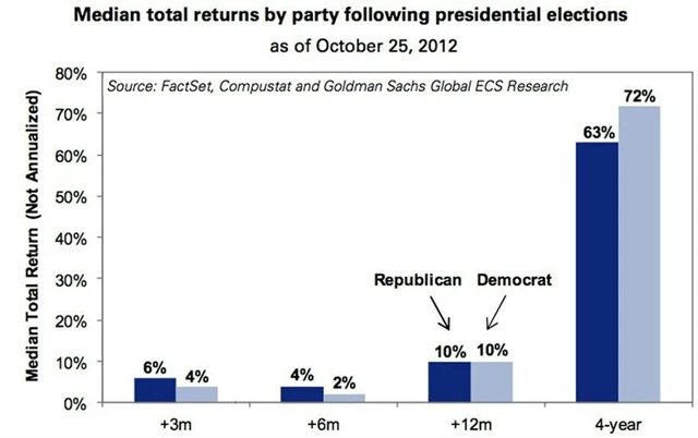 Trhy reagují v delším horizontu velice podobně, ať prezidentské volby v USA vyhraje republikán, nebo demokrat. Od poloviny 70. let minulého století se akcie po volbách vyvíjejí velice podobně. Tvrdí to David Kostin z Goldman Sachs. V nejkratším horizontu (3 až 6 měsíců) je výsledek nepatrně lepší po zvolení republikána, celé 4 roky pak dopadají mírně lépe pod demokratickým prezidentem. Vzorek ovšem zdaleka není dostatečný na pořádnou statistiku.