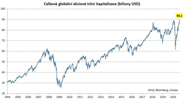 Světové akcie ještě nikdy nestály tolik. Celková kapitalizace překonala 90 bilionů USD