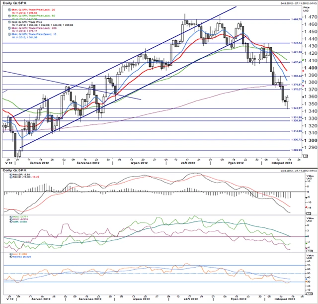 Situace na technických indikátorech je stále negativní, ale současně už vykazuje náznaky zlepšení. Myslíme si, že se index tento týden pokusí o stabilizaci po výrazném propadu. Směrem nahoru prozatím nepřekonatelnou zábranou pravděpodobně zůstane 200denní exponenciální klouzavý průměr okolo 1 375 bodů.