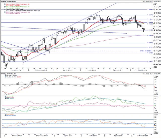 Index spadl až k důležité psychologické úrovni 7 000 bodů. 20denní průměr se chystá protnout 50denní shora. MACD pokračuje v poklesu a nadále se nachází pod spouštěcí linií. ROC20 vykazuje známky stabilizace, ROC60 se pohybuje okolo nuly. RSI se odrazilo od horní hranice pásma přeprodanosti.