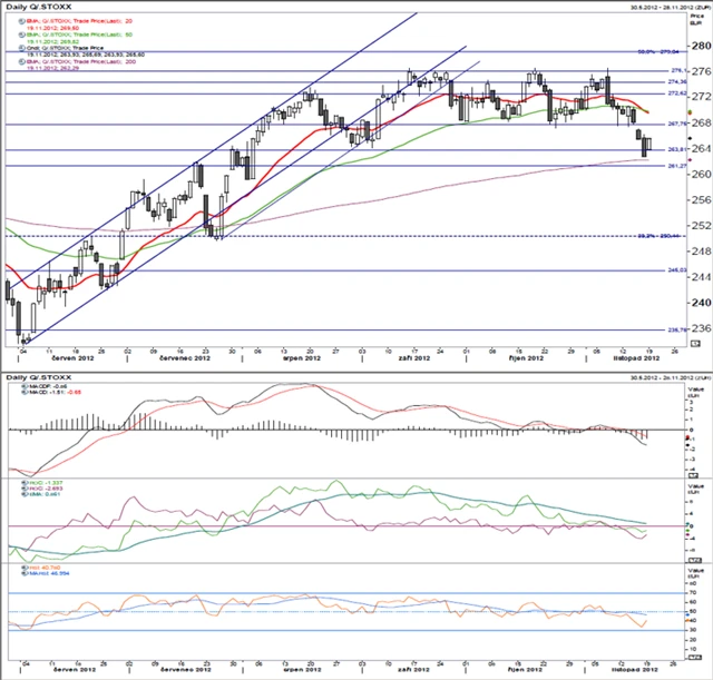 Celkově jsou technické indikátory nadále negativní. Nelze proto vyloučit brzké otestování 200denního klouzavého průměru. Očekáváme, že index v průběhu týdne otestuje 200denní klouzavý exponenciální průměr, což bude pro další vývoj klíčové. Při proniknutí pod něj hrozí další kolo poklesů, při udržení nad ním je ve hře stabilizace a vstřebání nedávných ztrát.