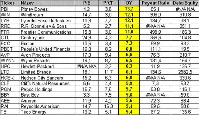 V první tabulce jsou znázorněny akcie z indexu S&P 500. Kromě dividendového výnosu je vhodné se zaměřit i na ukazatel výplatního poměru (payout ratio), který je alespoň základním vodítkem tohpo, zda je vyplácená dividenda dlouhodobě udržitelná (čím nižší hodnota, tím lépe). V neposlední řadě pak na ukazatel dluhu k vlastnímu jmění (Debt/Equity). Pokud má firma vysoké dluhy, hrozí, že by mohla omezit či zrušit výplatu dividendy a zaměřit se na splácení svých závazků (preferované jsou nízké hodnoty). P/E a P/CF slouží jako základní hodnotové ukazatele, které mohou být prvním vodítkem, které pomůže odhalit případné podhodnocení akcie. Čím nižší hodnota ukazatelů, tím lépe.
