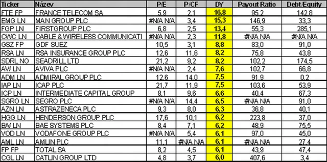 Akcie jsou seřazeny podle dividendového výnosu (DY) sestupně. V tabulce jsou dále uvedeny některé další ukazatele (P/E – cena akcie/zisk na akcii, P/CF – cena akcie/cash flow na akcii, Payout Ratio – výplatní poměr, Debt/Equity – dluh/vlastní jmění firmy).