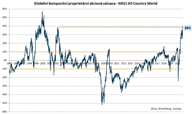 Globální korporátní zisky momentálně klesají meziročním tempem 27 %. V důsledku růstu cen akcií a poklesu korporátních fundamentů se valuace globálních akciových trhů dostaly na nejvyšší úroveň od roku 2002. Naše globální proprietární akciová valuace ve výsledku vzrostla na bezprecedentních +39 %. Přitom na začátku roku se globální akciová valuace pohybovala na výrazně nižší hladině +12 %.