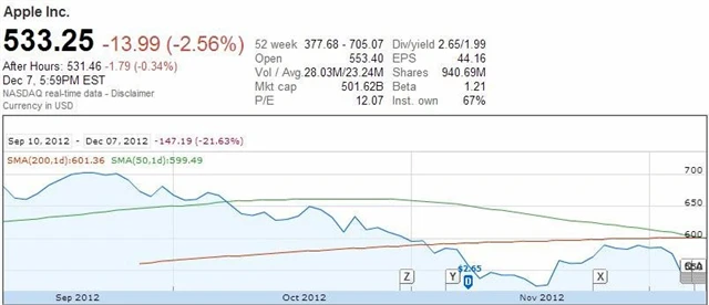 Podívejte se dobře na graf vývoje ceny akcií společnosti Apple. Ty od svých maxim v polovině září ztratily zhruba čtvrtinu hodnoty. "Čumák" legendárního nadzvukového dopravního letounu je ve skutečnosti tvořen liniemi vývoje 50denního a 200denního klouzavého průměru ceny akcií Applu. A protože koncem týdne první jmenovaný shora dolů prorazil skrze linii toho druhého, příznivci technické analýzy vědí, že má za sebou Apple takzvaný kříž smrti.