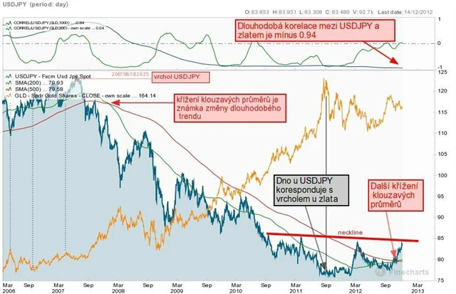 Cena USDJPY je modře, žlutě je zobrazena cena zlata. Od června 2007 začal dolar relativně oslabovat vůči jenu. Z grafu je patrné, že to byla velmi výhodná situace pro zlato. Relativně slabý dolar znamená silné zlato, korelace je -O,94 za 1 000 dnů. Korelační koeficienty jsou v horním panelu. V září 2011 se však situace změnila – dolar dopadl na dno vůči jenu a u zlata začaly potíže. Jeho cena začala klesat s tím, jak posiloval USD proti JPY.