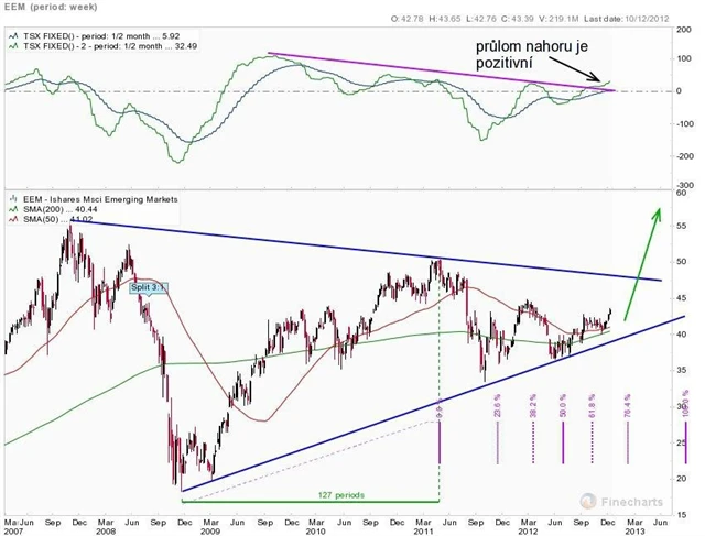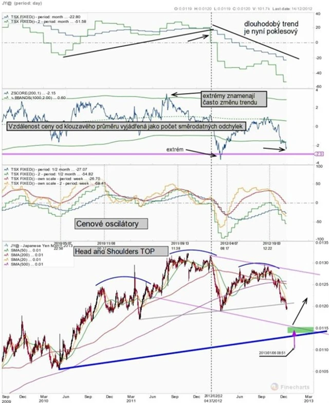 Podle horního měsíčního oscilátoru je trend u JPY nyní poklesový, což je pro zato nevýhodné. Akcie jsou zkrátka jako investiční alternativa lepší, jejich potenciální výnos je vysoký a riziko vzhledem ke slabému jenu nízké. Avšak prostřední grafický panel ukazuje, že je cena nyní více než dvě směrodatné odchylky od 200denního průměru, což už je extrém. Ani jen nebude oslabovat věčně, první růst by se mohl odehrát zhruba v lednu 2013, když by se cena jenu mohla dostat na podporu, na níž se objeví zvýšené objemy nákupů. Pak by mohla přijít řada týdnů relativní síly jenu, tedy situace výhodná pro zlato a stříbro.