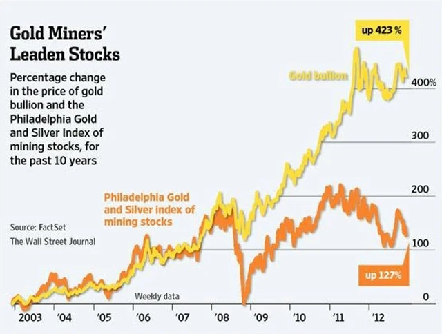 Zatímco zlato minulý rok přidalo 10 %, Philadelphia Gold & Silver Index, který sleduje vývoj akcií předních těžařů vzácných kovů, poklesl o 8 % kvůli obavám z růstu nákladů na těžbu a politickým rizikům.