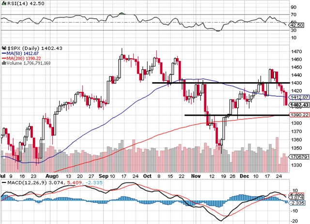 Při poklesu se indikátory změnily na negativní. Index S&P 500 v pátek uzavřel na hodnotě 1 402,43, tedy ještě v neutrálním pásmu 1 390 až 1 420 bodů. Při zavírací ceně na nižších hodnotách se graf indexu změní na negativní se supportem v zóně 1 350 bodů.