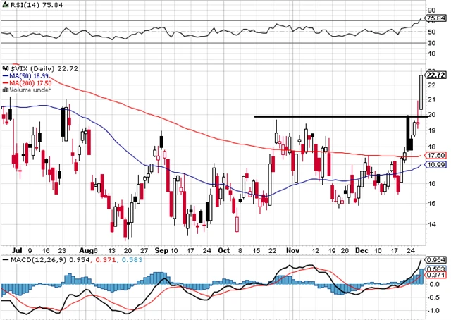 Index volatility VIX v pátek uzavřel zcela jasně v negativním teritoriu, když posledních 15 minut páteční seance rostl o 10 procentních bodů z celkových 16,69 % růstu. Za prosinec se index strachu posunul o 48 %.