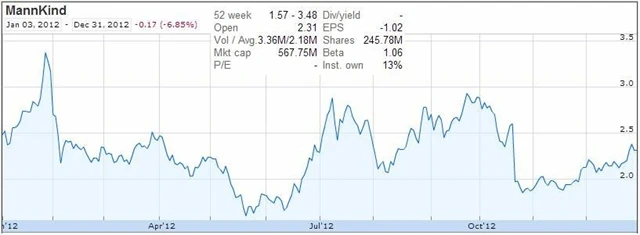 Testy nového přístroje by měly právě finišovat. V roce 2013 by se Afrezza mohla dočkat konečného schválení, což by samozřejmě znamenalo raketový růst ceny akcií firmy, protože Afrezza skýtá potenciál miliardových tržeb. Naopak jakákoli negativní informace a další oddálení výroby a prodeje Afrezzy by vedly ke značným ztrátám. MannKind má prozatím nulové tržby, takže firma by musela shánět další finance na zaměstnance a vývoj (pravděpodobně úpisem nových akcií).