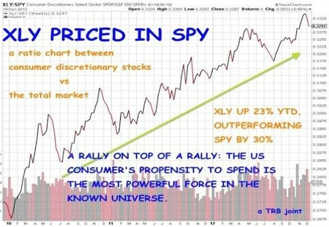 Síla amerických spotřebitelů je samozřejmě relativní pojem. Pohled na graf vývoje akcií firem ze spotřebitelského sektoru (consumer discretionary) vyjádřený v ceně celého indexu S&P 500 je ovšem přinejmenším zajímavou ilustrací toho, že americké firmy zaměřené na koncové zákazníky umějí vydělávat a lákat investory k nákupu svých akcií. V roce 2012 patřily k nadprůměrně výkonným titulům například Home Depot, Disney, Starbucks nebo Amazon.