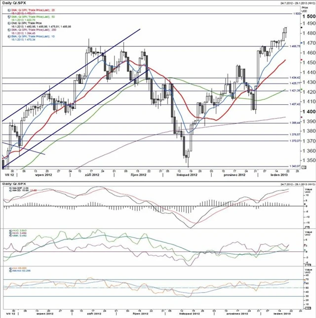 Index S&P 500 se po chvilkovém zaváhání opět vydal výše a má nakročeno k psychologické úrovni 1 500 bodů. MACD pokračuje v růstu a drží se nad spouštěcí linií. Obě ROC rostou, ROC60 navíc nad svým 20denním klouzavým průměrem. RSI se dotýká hranice překoupenosti (70 bodů).