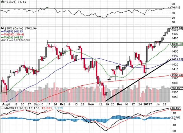 Také čtvrtý týden roku 2013 akcie pokračovaly v růstu. Index S&P 500 v pátek uzavřel po více než pěti letech nad 1 500 bodů. K historickému maximu závěrečné ceny 1 565 z 9. října 2007 již akcie nemají daleko (4,1 %).