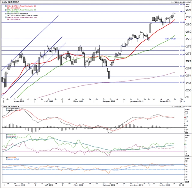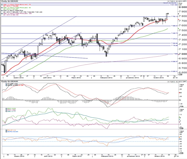 Celkově jsou technické indikátory lehce pozitivní a nestojí (snad kromě téměř překoupeného RSI) v cestě indexu výše. Očekáváme, že index bude mít tento týden tendenci k pokračování růstu. Známkou slábnoucího momenta by byl případný pokles pod 20denní klouzavý průměr.