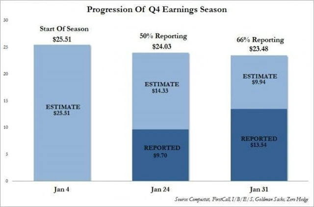 Odhady analytiků se před zveřejňováním údajů za poslední loňský kvartál totiž snižovaly několik měsíců. Jak navíc ukazuje graf, odhady celkové ziskové bilance se s postupující výsledkovou statistikou dále zhoršují.