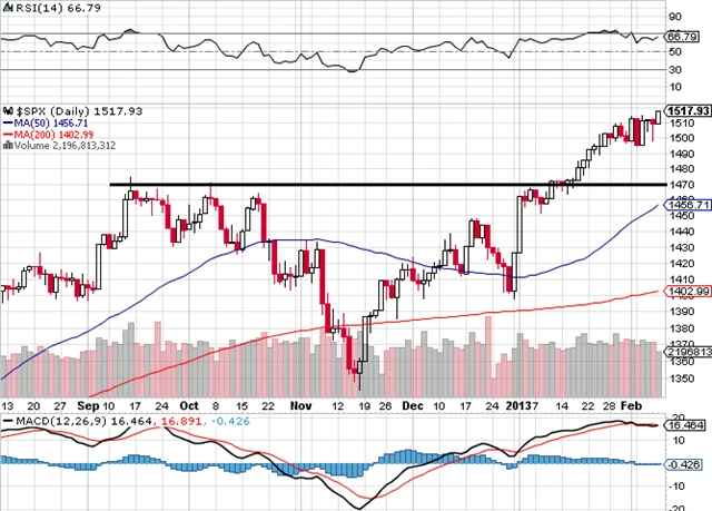 Index S&P 500 se téměř dva týdny obchodoval v rozpětí 1 495 až 1 515 bodů. V pátek uzavřel na hodnotě 1517,93 a vydal se mírně vzhůru. Platnost směru zatím nebyla potvrzena objemem obchodů, ten byl totiž podprůměrný. Přesto prolomení jedné z linií zřejmě určí další směr vývoje cen akcií.