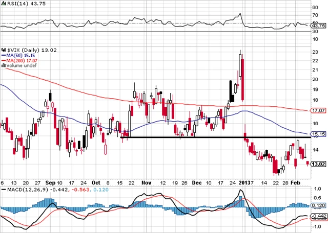 Index volatility VIX se obchoduje v pásmu 13 až 15 bodů. Negativním signálem pro akcie bude jeho případné zavření nad 15.