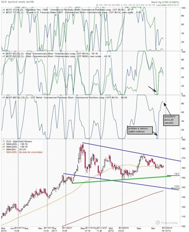 Commercials jsou nejvýznamnější obchodníci na trhu s futures, jsou protiváhou spekulantů. Jsou to většinou investiční banky, u zlata a stříbra pak těžební společnosti a zpracovatelé kovů. Všechny indikátory ukazují takzvané Net SHORT pozice, tedy rozdíl mezi SHORT a LONG pozicemi za 14, respektive 60 týdnů. Čím více LONG otevřených pozic drží Commercials, tím je větší šance, že zlato (nebo jiné aktivum) v několikaměsíčním výhledu cenově poroste. A naopak, čím větší jsou Net SHORT pozice (indikátory jsou blíže maximům), tím je větší šance na pokles ceny. V růstovém trendu mohou SHORT pozice narůstat dlouhou dobu, protože čím je cena pro těžební společnosti výhodnější, tím více kovů chtějí prodat.