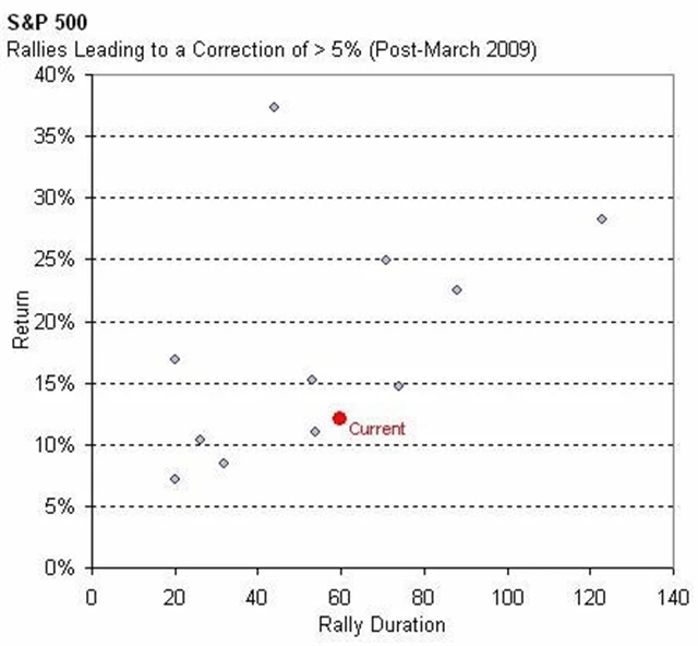 Současný růst akciového trhu není sice tak silný jako v minulých letech, neobvyklé je ale na současné rally její trvání bez výrazné korekce. Následující graf od Stone & McCarthy ukazuje, že od března 2009 pokračovala rally bez minimálně 5% korekce déle jen ve čtyřech případech.