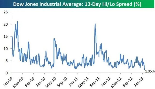O stabilitě současné rally vypovídá i následující graf z dílny Bespoke Investment Group. Denní spread mezi nejvyšší a nejnižší cenou indexu je za posledních 13 obchodních dnů (do středy včetně) pouze 1,35 procentního bodu, což je nejméně za takto dlouhé období nejen od začátku býčího trhu v březnu 2009, ale dokonce od roku 1986.