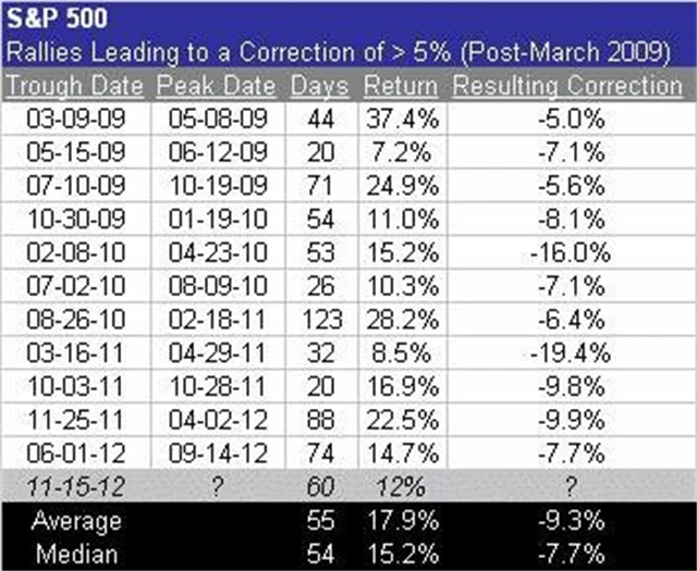 Jak odhaluje report Stone & McCarthy, 60denní obchodování bez minimálně 5% korekce přesahuje průměr i medián od března 2009. Procentuálně vzato současná 12% rally (od minima 15. listopadu 2012) ale stále zaostává za 15% mediánem a 18% průměrem.
