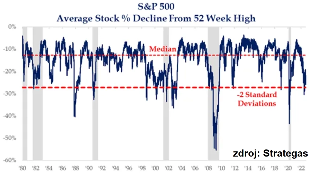 V rámci indexu S&P 500 je průměrná akcie (opět) velice hluboko pod svým ročním cenovým maximem. Dvě směrodatné odchylky do mínusu byly v historii velice často již dostatečným "výplachem" pro odraz výše, výjimky z let 1987, 2008 nebo 2020 jsou nicméně varováním pro ty, kdo by se snad navzdory všem poučkám snažili z minulosti cokoli vyvozovat.
