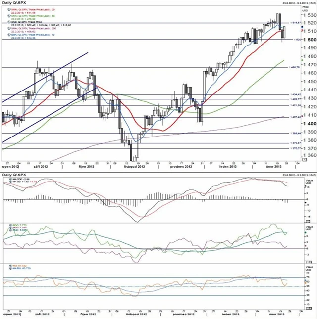 Celkově jsou technické indikátory lehce negativní a poskytují prostor k pokračování korekce. Pro tento týden očekáváme (dle hlavního scénáře) vývoj do strany. Případnou korekci (v řádu jednotek procent) by mohl odstartovat pokles pod hranice 1 500 a 1 495 bodů. To by otevřelo cestu až k 1 470 bodům.