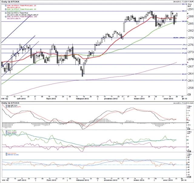 Celkově jsou technické indikátory víceméně neutrální, ale stačí jeden výraznější denní nárůst a MACD by mohlo vydat nákupní signál, který by index pravděpodobně poslal nad předchozí dvojnásobný lokální vrchol okolo 290 bodů. Očekáváme, že index v průběhu tohoto týdne bude mít tendenci k mírnému posílení. Zároveň se obchodní pásmo zužuje, proto se zvyšuje pravděpodobnost výkyvu. Důležitými technickými úrovněmi jsou 290 (pro případný pohyb nahoru) a 50denní klouzavý průměr (pro případnou korekci).