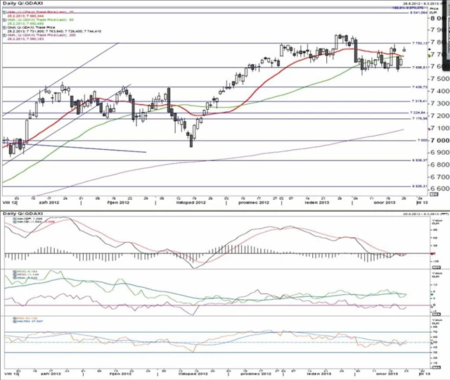 Technické indikátory jsou v souhrnu víceméně neutrální. Očekáváme, že index v průběhu týdne bude pokračovat ve vývoji směrem do strany. Pokles pod 7 580 by mohl indikovat případnou korekci.