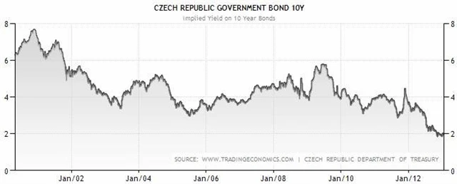 Podobná je situace i v České republice. Státní dluhopis se splatností v roce 2022 se nyní obchoduje za 125 % nominálu. Tento dluhopis sice nese úrok 4,7 % ročně z nominálu, ale vzhledem k tržní ceně vychází výnos do splatnosti na pouhá 2 % p.a. Nesmíme totiž zapomenout, že onen dluhopis si nyní koupíme za 12 500 korun, ale v roce 2022 za něj od státu dostaneme zpět pouze nominální hodnotu 10 000 korun. Jak ukazuje následující graf, také v České republice úrokové výnosy dluhopisů klesly na historické minimum a jsou nižší, než nabízejí některé termínované vklady.