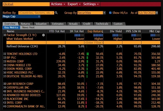 Z globálních firem s vůbec největší tržní kapitalizací (tedy z takzvaných "megacap" firem) by se nejvíce mělo dařit čínskému technologickému obru Tencentu, jemuž analytici v roce 2024 předpovídají více než 50procentní zhodnocení. Následuje britský petrochemický gigant BP a NVIDIA, jež se má i v příštím roce vézt na vlně AI-mánie. Oba tyto tituly mají zhodnotit o více než 30 procent. Investoři by se naopak měli obloukem vyhnout akciím třeba takového Intelu, případně spekulovat na jejich pokles (viz tabulka níže, třetí sloupec).