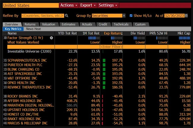 Ze všech amerických firem (nyní tedy už bez ohledu na tržní kapitalizaci) si má nejvíce polepšit společnost SC Pharmaceuticals, a to takřka o 200 procent. Zaměřuje se na inovace ambulantní péče o pacienty s akutními zdravotními problémy. Zhodnocení přes 195 procent se mají dočkat ještě akcie biotechnologické firmy Puretech Health, jež se zaměřuje na rozvoj léčiv a terapií pro boj s vážnými chorobami, a firmy Blink Charging, zaměřující se na budování sítí nabíjecích stanic pro elektromobily.