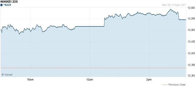 Investoři v Asii přijali s nadšením dohodu o restrukturalizaci bank na Kypru, která zemi zajistí přístup k záchrannému balíku od mezinárodních věřitelů. Japonský akciový index Nikkei 225 posílil o 1,69 % na 12 546,46 bodu, v plusu byla většina asijských burz. Euro se vrátilo nad 1,30 EUR/USD.