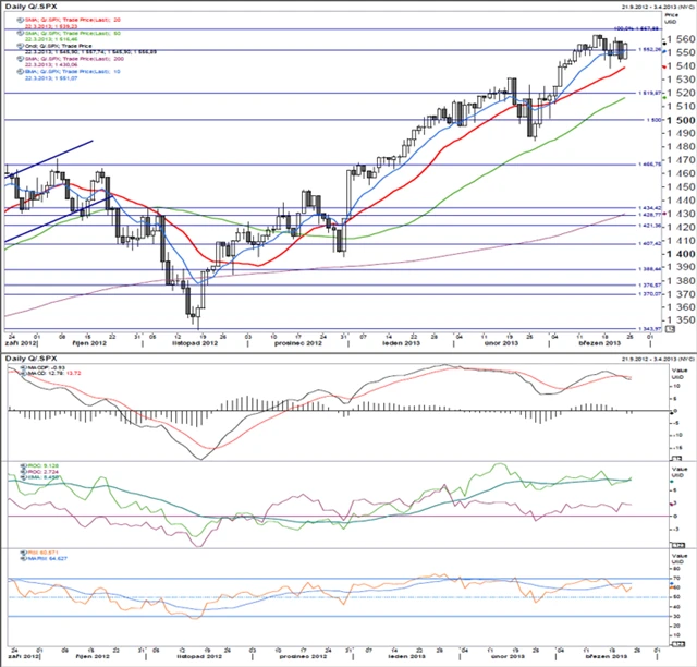 Index se nadále drží těsně pod historickým maximem. Hlavní klouzavé průměry pokračují v růstu. MACD kleslo (shora) pod spouštěcí linii a vydalo prodejní signál. Obě ROC mírně rostou. ROC60 zpátky těsně nad svým 20denním klouzavým průměrem. RSI potvrdilo svůj pokles pod 14denní klouzavý průměr. Nadále se ale drží nad 50 body.