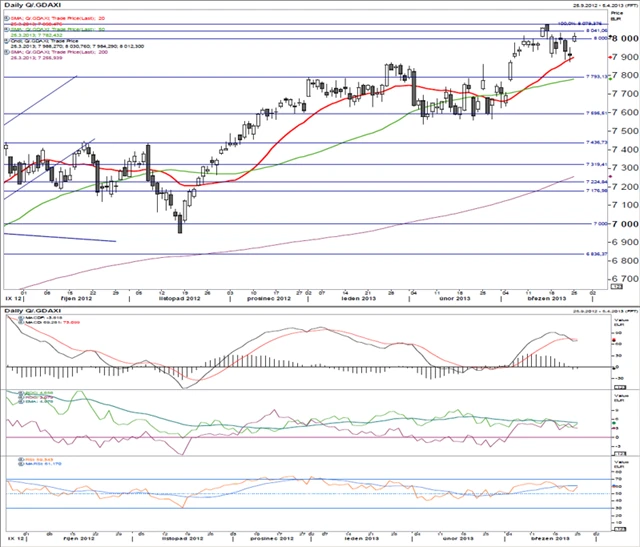 Technické indikátory jsou celkově mírně negativní. Překonání úrovně 8 000 bodů by ale celkem snadno mohlo vydat nákupní signál na MACD a celá situace by se zlepšila. Očekáváme, že index v průběhu tohoto týdne opět otestuje psychologickou úroveň 8 000 bodů, která bude pro další vývoj určující.