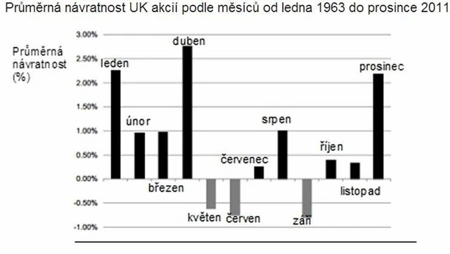 Podobně pozoruhodný fenomén sezónnosti je zachycen na druhém grafu. Zachycená historická průměrná návratnost na akciovém trhu Spojeného království ukazuje, že se leden, duben a prosinec ukazují jako silné měsíce, zatímco období od května do listopadu bývá slabé. Vypadá to, že se naplňuje přísloví "prodej v květnu a jdi pryč". Jako by šlo celkem jednoduše vydělat na tom, že se akcie nakoupí na podzim, na jaře se prodají a další nákupy se odloží až na následující podzim.