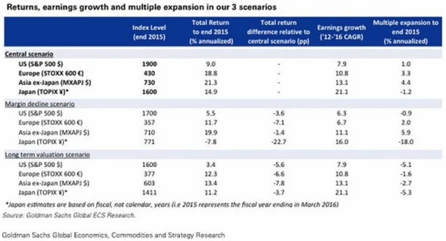 Nejpozitivněji Goldman Sachs nahlíží na asijské burzy, když předpokládá jejich průměrné roční zisky ve výši 21 %. Výjimkou by měla být pouze burza v Tokiu, u níž analytici s ohledem na strukturální transformaci japonské ekonomiky neočekávají překročení 15% hranice. Velice pozitivní je i výhled pro evropské trhy, které by měly v průměru přidávat okolo 19 %. Relativně skepticky naopak Goldman Sachs nahlíží na Spojené státy, u nichž analytici stanovili horní hranici ročních zisků na 9 %. Přesto by však akciový index S&P 500 měl do roku 2015 dosáhnout úrovně 1 900 bodů.