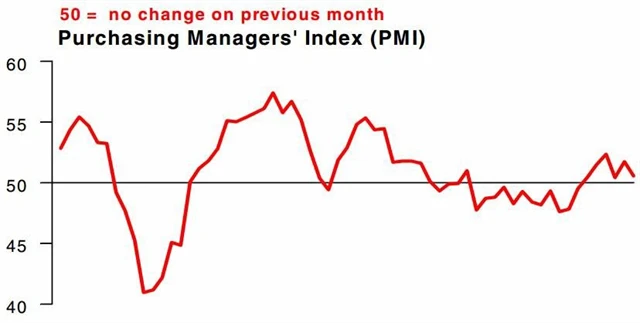 Vývozní zakázky i zaměstnanost tento měsíc klesly. Vývoz je v posledních dvou letech Achillovou patou ekonomiky kvůli zpomalujícímu globálnímu ekonomickému růstu. Oživení ekonomiky v USA zůstává slabé a eurozóna míří do recese. Výroba sice nadále rostla, avšak pomaleji než v předchozím měsíci.