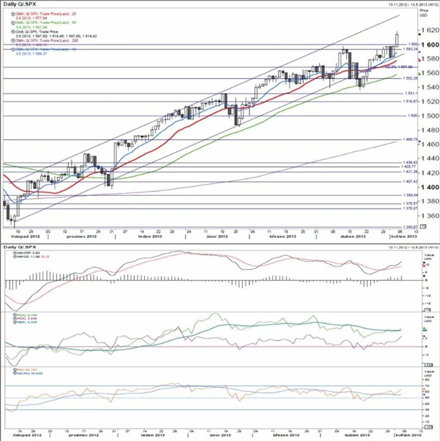 Index prolomil důležitou úroveň odporu na 1 600 bodů a zamířil na nová historická maxima. MACD roste a vzdaluje se od spouštěcí linie. Obě ROC rostou, ROC60 se dostává nad svůj 20denní klouzavý průměr. RSI pokračuje v nárůstu nad 14denní klouzavý průměr.