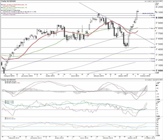 Technické indikátory jsou celkově pozitivní, ale téměř překoupené RSI indikuje možný prostor pro vybírání zisků. Očekáváme ale, že se index udrží nad důležitou technickou úrovní 8 000 bodů.