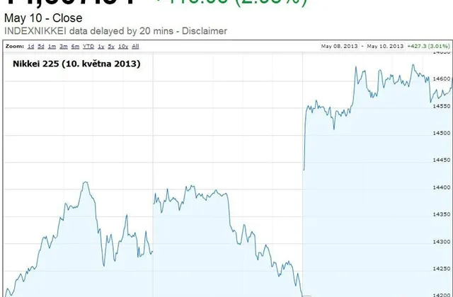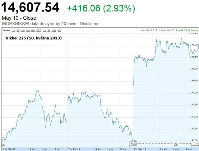 Japonské akcie v pátek prudce posílily a jejich hlavní index uzavřel na více než pětiletém maximu. Vzhůru zamířily zejména exportní společnosti, které těžily z vyhlídek na vyšší zisky v důsledku slabší domácí měny. Hlavní index tokijské burzy Nikkei 225 přidal 2,93 % na 14 607,54 bodu.
